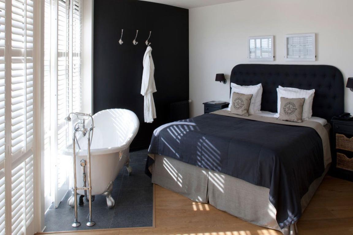 Maritime Romantik erzeugen in der Romantik Junior-Suite eine alt-englische Badewanne auf Füßen im Zimmer, die großen Fenster mit romantisch-verspielten Fensterläden und die Sitzecke mit Sofa. Die Zimmer haben keinen seitlichen oder frontalen Blick aufs Meer sondern auf den “Uitwateringskanaal” und Cadzand. Aber bei der romantischen Inneneinrichtung ist das auch nicht notwendig…