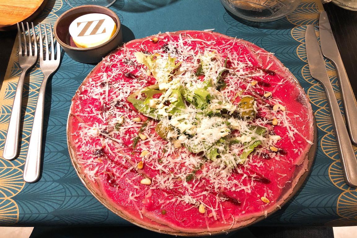 Na de begroeting vanuit de keuken met smakelijke en decoratieve boter en zelfgebakken brood, besloten we te beginnen met de rundercarpaccio “Deining” ter nagedachtenis aan het oude restaurant in Groede, dat eveneens onder de dijk ligt. De flinterdunne, bladdunne plakjes die op de tong gesmolten zijn, de lichte marinade van olijfolie, knoflook, pijnboompitten en ruccola, evenals de delicate besprenkeling met Parmezaanse kaas, benadrukten subtiel de eigen smaak van het rundvlees.