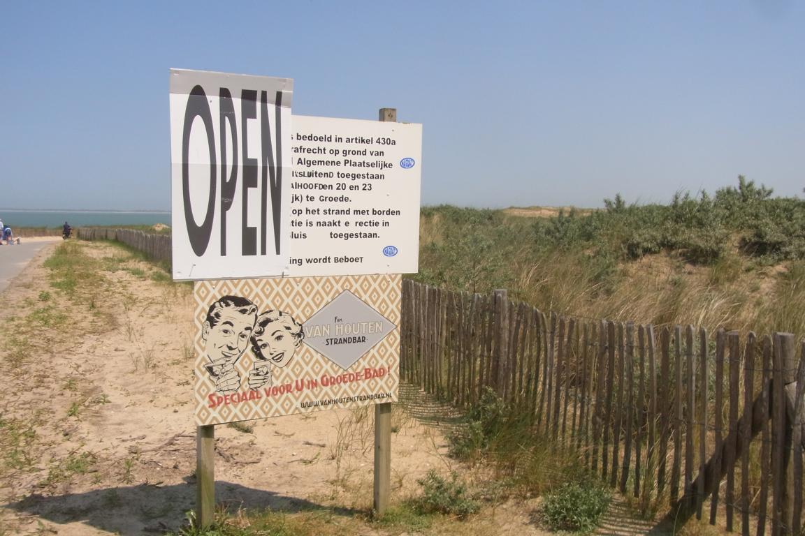 Het strandbar “van Houten” met uitzicht op de Westerschelde en het strand ligt ten westen van het nieuwe natuurgebied “Waterdunen” (tussen 20 en 23 palen) – het enige officiële Naaktrecreatie strand tussen Breskens en Cadzand-Bad.