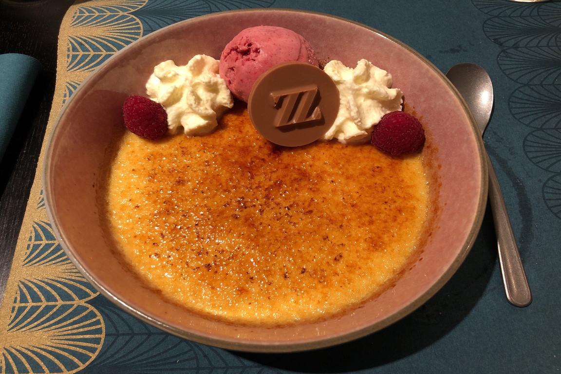 Ganz klassisch gönnten wir uns dann zum Dessert eine sehr sahnig-cremige – und erfreulich nicht überzuckerte – „Creme Brulee“ und für die Dame eine geschmacksintensive „Dame blanche“.